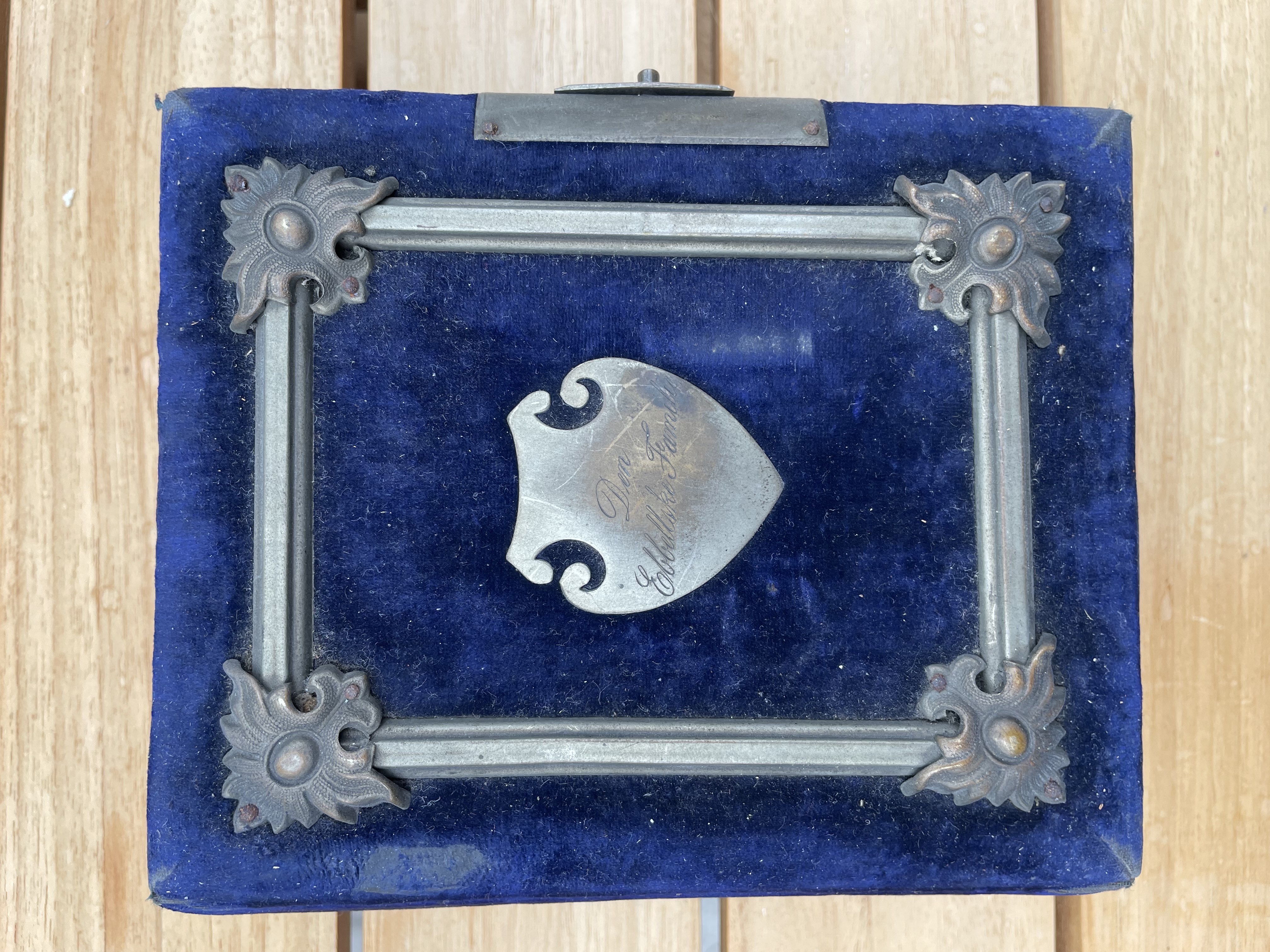 Noter:Bindet er i blåt fløjl på kraftigt pap. På forside og bagside er der forsølvede messing ornamenter. Teksten i våbenskjoldet lyder "Den Ebbellske Familie". Siderne er ligeledes af kraftigt pap..