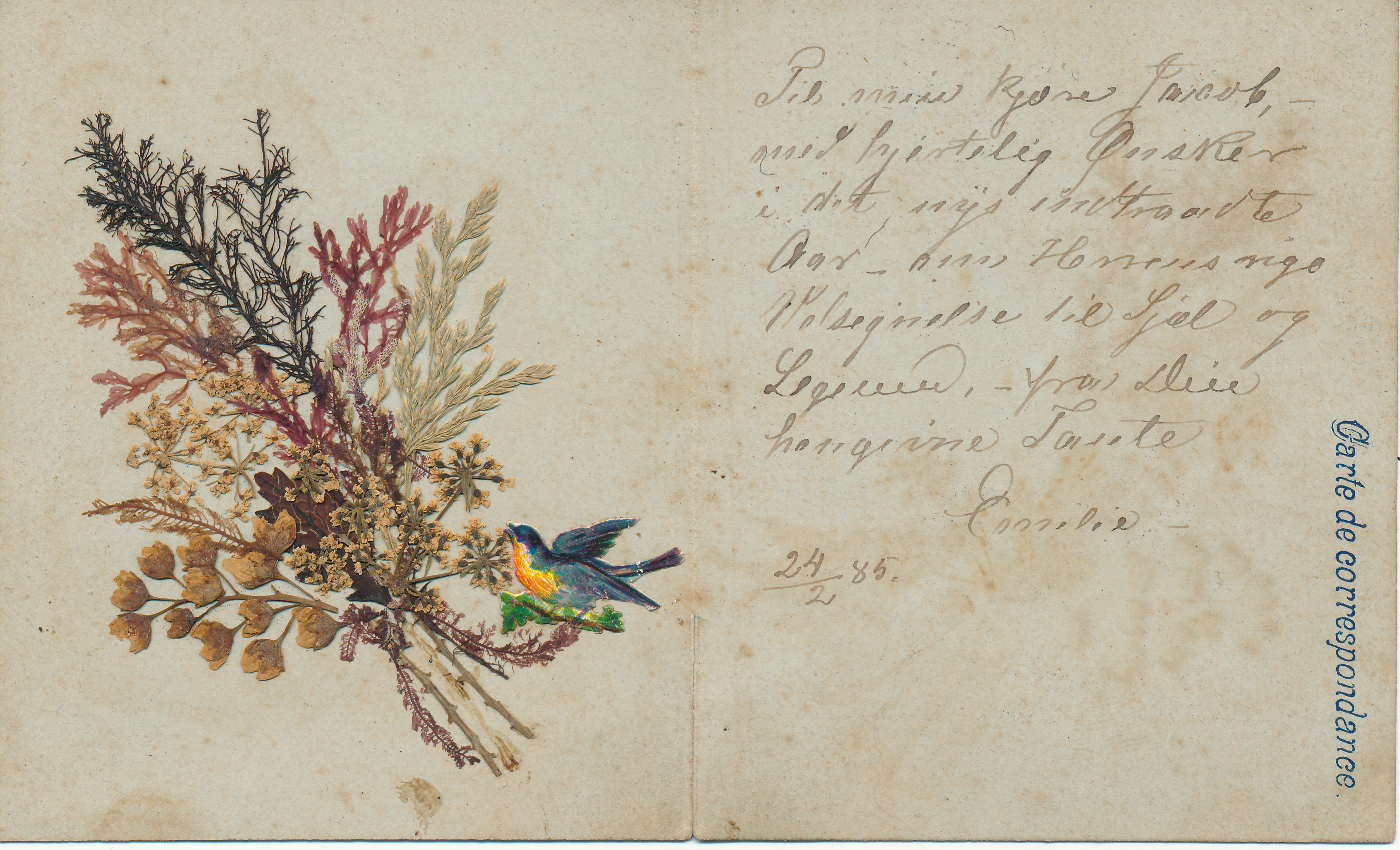 Til min kjære Jacob, med hjertelig Ønsker i det nys indtraadte Aar - maa Herrens rige Velsignelse til Sjæl og Legeme, fra din hengivne Tante Emilie 24/2 85 | på Fotoalbummets oversigtsside findes en forklaring på hvem Emlie og Jacob kan være. |