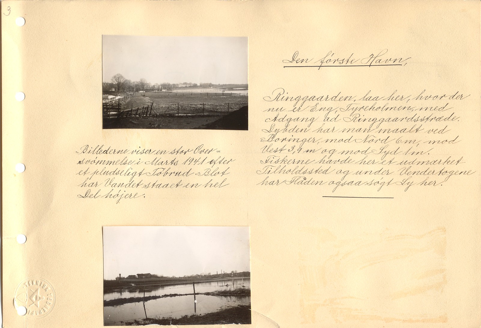 Den første Havn, Ringgaarden, laa her, hvor der nu er Eng, Tyreholmen, med Adgang ad Ringgaardsstræde. Dybden har man maalt ved Boringer, mod Nord 6 M, mod Vest 3,9 M og mod Syd 1 M. Fiskerne havde her et udmærket Tilholdssted og under Vendertogene har Flaaden ogsaa søgt Ly her. Teksten mellem billederne: Billederne viser en stor Oversvømmelse i Marts 1941 efter et pludseligt Tøbrud. Blot har Vandet staaet en hel Del højere |