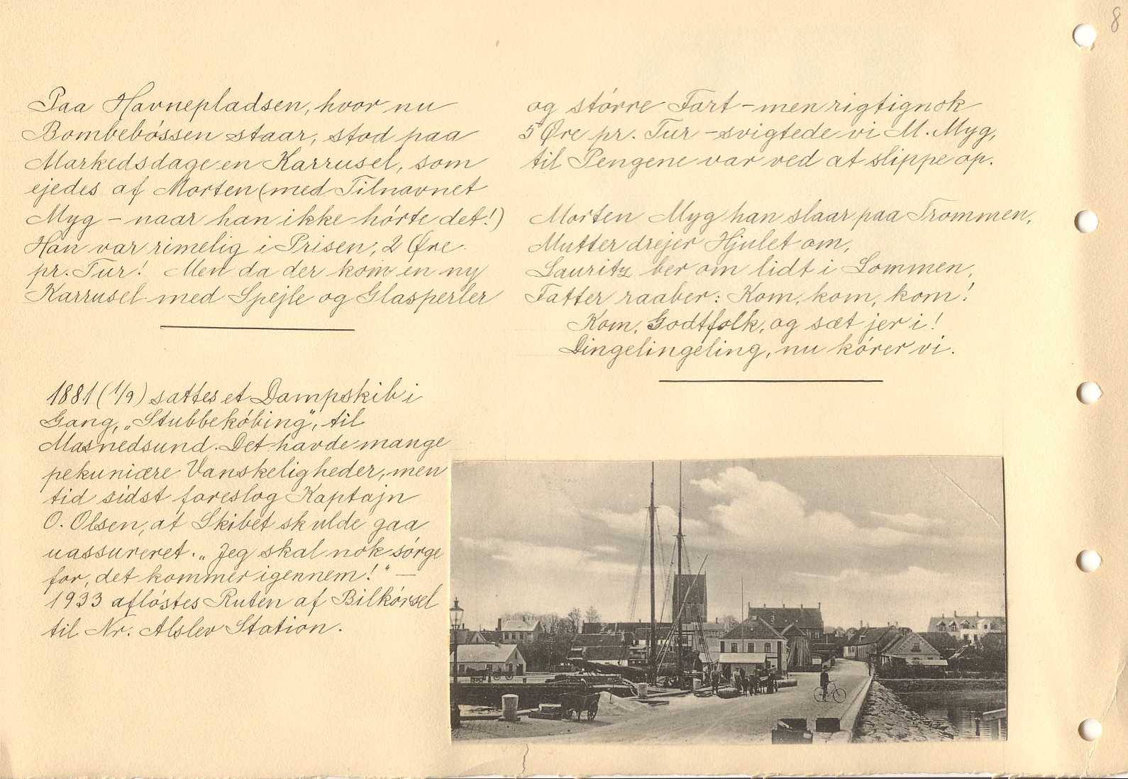 Paa Havnepladsen, hvor nu Bombebøssen staar, stod paa Markedsdage en Karrusel, som ejedes af Morten (med Tilnavnet Myg - naar han ikke hørte det!) Han var rimelig i Prisen, 2 Øre pr. Tur! Men da der kom en ny Karrusel med Spejle og Glasperler og større Fart - men rigtignok 5 Øre pr. Tur - svigtede vi M. Myg, til Pengene var ved at slippe op. Morten Myg han slaar paa Trommen, Mutter drejer Hjulet om, Lauritz beder om lidt i Lommen, Fatter raaber: Kom, kom, kom! Kom, Godtfolk, og sæt jer i! Dingelingeling, nu kører vi. 1881 (1/9) sattes et Dampskib i Gang, "Stubbekøbing", til Masnedsund. Det havde mange pekuniære Vanskeligheder, men tid sidst foreslog Kaptajn O. Olsen, at Skibet skulle gaa uassureret. "Jeg skal nok sørge for, det kommer igennem!" - 1933 afløstes Ruten af Bilkørsel til Nr. Alslev Station. |