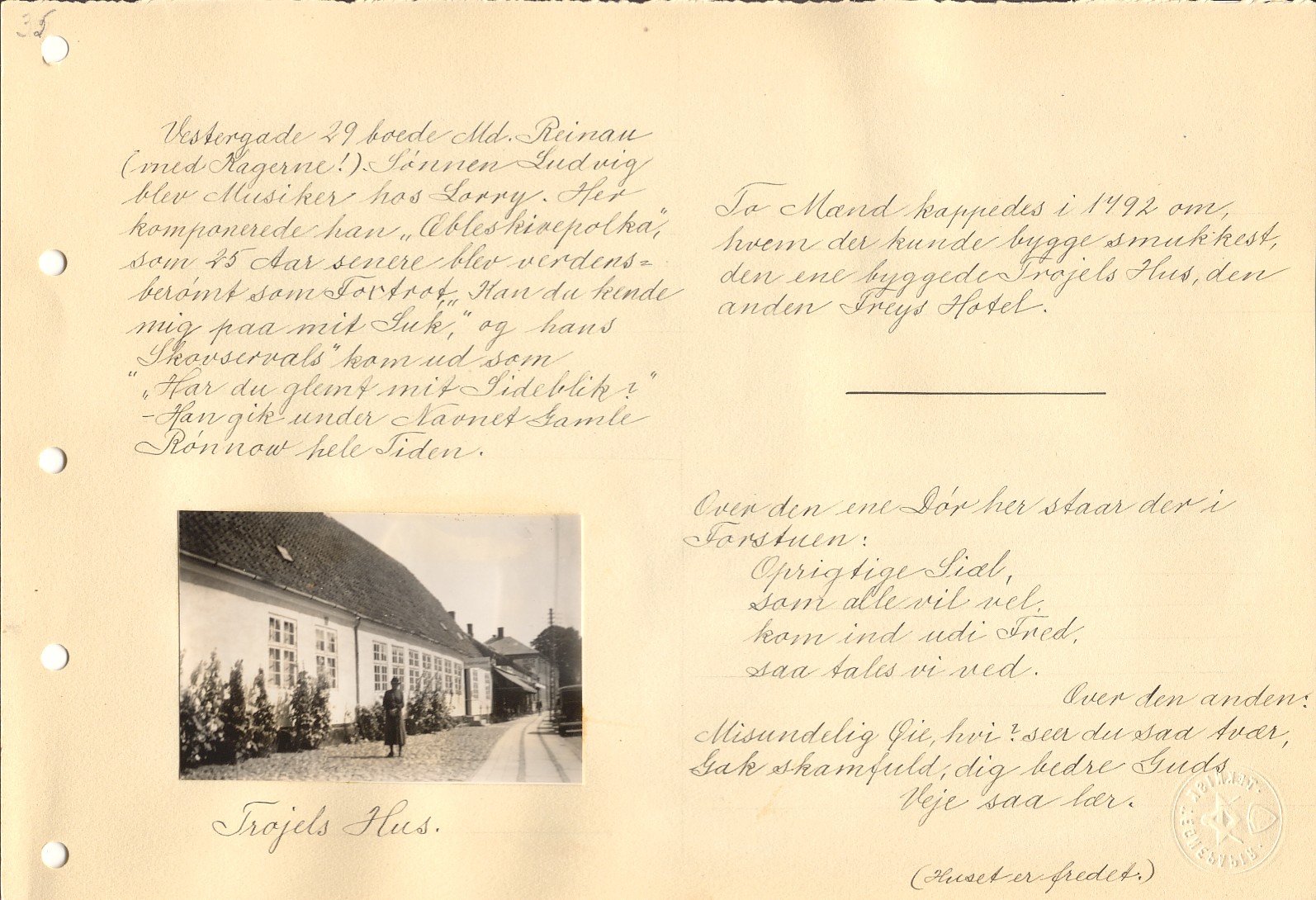 Vestergade 29 boede Md. Rainau (med Kagerne!). Sønnen Ludvig blev Musiker ved Lorry. Her komponerede han "æbleskivepolka", som 25 Aar senere blev verdensberømt som foxtrot "Kan du kende mig paa mit Suk", og hans "Skovservals" kom ud som "Har du glemt mit Sideblik?" - han gik under Navnet gamle Rønnow hele Tiden.