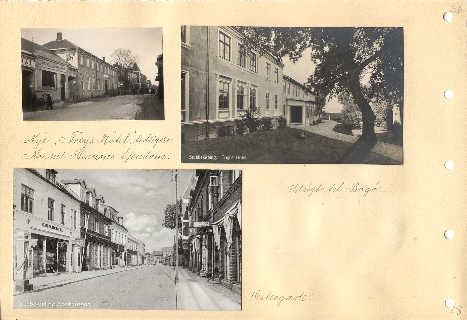 Tekst på øverste højre postkort: Stubbekøbing. Frey's Hotel.