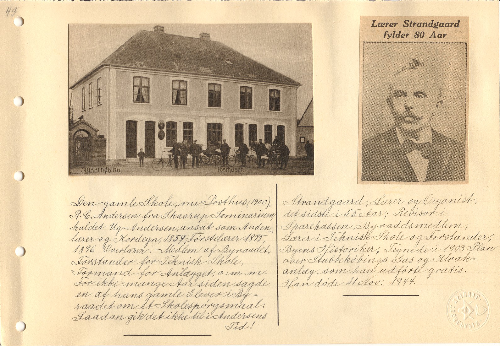 teksten på avisudklippet til højre: Lærer Strandgaard fylder 80 Aar